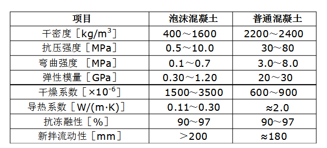 泡沫混凝土作為一種新型材料,具有保溫隔熱,兼具防水,防火等性能。由于其施工簡單,保溫隔熱性能良好,作為現(xiàn)有隔熱材料陶粒的替代品被廣泛運用在工程項目中。其基本原理是利用混凝土中封閉氣孔達到保溫隔熱的效果。表1為正常養(yǎng)護條件下,普通混凝土與泡沫混凝土物理力學性能的比較。