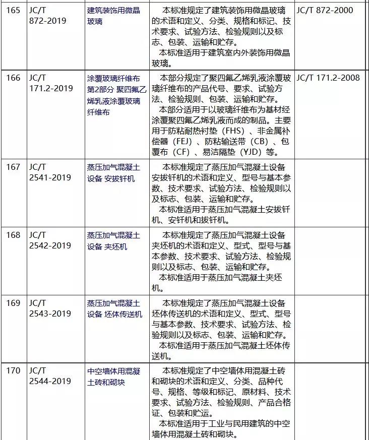 其中,涉及多項墻體材料產(chǎn)品、設(shè)備標(biāo)準,包括《蒸養(yǎng)泡沫混凝土制品用摻合料》(JC/T 2554-2019)、《蒸壓加氣廣西混凝土設(shè)備安拔釬機》(JC/T 2541-2019)、《蒸壓加氣混凝土設(shè)備 夾坯機》(JC/T 2542-2019)、《蒸壓加氣混凝土設(shè)備坯體傳送機》(JC/T 2543-2019)、《中空墻體用混凝土磚和砌塊》(JC/T 2544-2019)、《泡沫混凝土自保溫砌塊》(JC/T 2550-2019)、《絕熱材料中可溶出氯化物、氟化物、硅酸鹽和鈉離子的化學(xué)分析方法》(JC/T 618-2019)等。